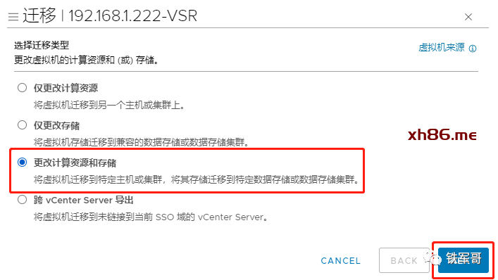 然后我们开始配置迁移,点击主机“操作”选项中的“迁移”。