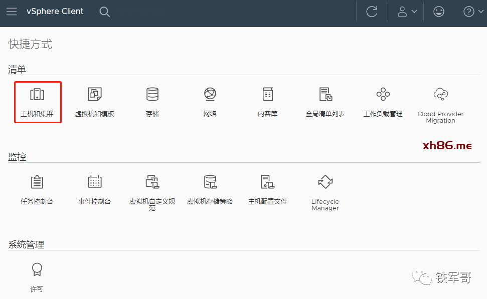 首先,还是要先添加ESXi主机。在主页,我们先点击“清单”下面的“主机和集群”。