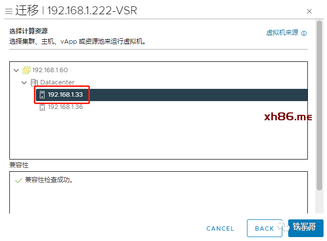 计算资源选择到主机192.168.1.33,提示兼容性检查成功,点击“NEXT”。