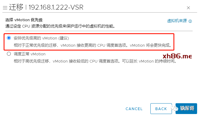 到“选择vMotion优先级”这里,我们选择建议的“安排优先级高的vMotion”,点击“NEXT”。