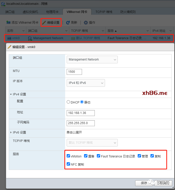 这次我发现已经无法再创建新的VMkernel网卡,但是可以选中默认的管理网卡,点击“编辑设置”,修改服务选项,我暂时还没弄明白各个服务的差异,就都选上了。