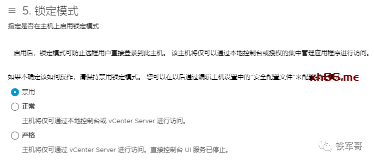 锁定模式,一般不建议启用,保持默认的“禁用”即可;如果是正规的数据中心,应该要进行管控,防止远程用户直接登录到ESXi主机。