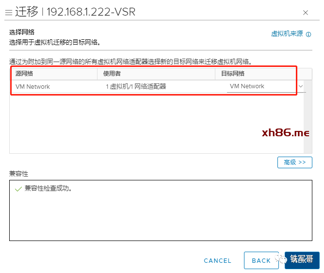选择网络,要注意检查前面提到的端口组的属性配置是否完全一致,否则会报错。此处提示兼容性检查成功,点击“NEXT”。