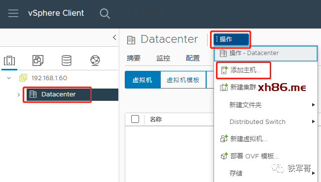 新建完成之后,选中新建好的数据中心,点击“操作”选项中的“添加主机”。