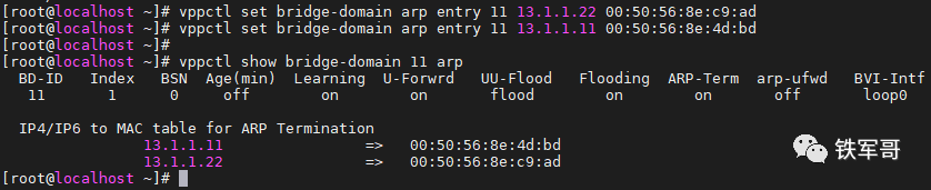 vppctl set bridge-domain arp entry 11 13.1.1.22 00:50:56:8e:c9:advppctl set bridge-domain arp entry 11 13.1.1.11 00:50:56:8e:4d:bd