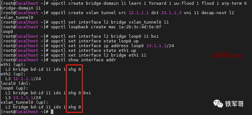 VPP官网还特别强调,在将VXLAN隧道接口、BVI/环回口和以太网口添加到BD时,必须为它们配置相同且非零的水平分割组(Split Horizon Group,SHG)编号。否则,泛洪数据包可能会在具有相同VXLAN标识的服务器之间产生环路。