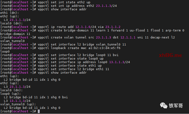 vppctl set int state eth2 upvppctl set int ip address eth2 23.1.1.3/24vppctl ip route add 12.1.1.0/24 via 23.1.1.2vppctl create bridge-domain 11 learn 1 forward 1 uu-flood 1 flood 1 arp-term 0vppctl create vxlan tunnel src 23.1.1.3 dst 12.1.1.1 vni 11 decap-next l2vppctl set interface l2 bridge vxlan_tunnel0 11vppctl loopback create mac a1:b2:c3:d4:e5:f6vppctl set interface l2 bridge loop0 11 bvivppctl set interface state loop0 upvppctl set interface ip address loop0 13.1.1.3/24vppctl set interface state eth1 upvppctl set interface l2 bridge eth1 11