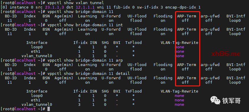 vppctl show bridge-domain 11vppctl show bridge-domain 11 intvppctl show bridge-domain 11 arpvppctl show bridge-domain 11 detail