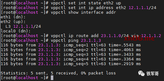 vppctl set int state eth2 upvppctl set int ip address eth2 12.1.1.1/24vppctl ip route add 23.1.1.0/24 via 12.1.1.2