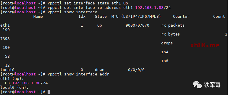 vppctl set interface state eth1 upvppctl set interface ip address eth1 192.168.1.88/24