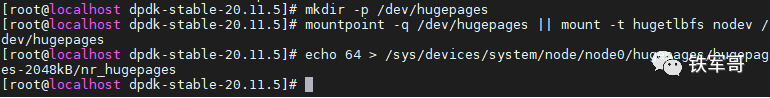 mkdir -p /dev/hugepagesmountpoint -q /dev/hugepages || mount -t hugetlbfs nodev /dev/hugepagesecho 64 > /sys/devices/system/node/node0/hugepages/hugepages-2048kB/nr_hugepages