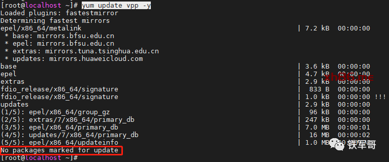 我们先用命令yum update vpp -y看一下YUM仓库里面更新版本了没有。