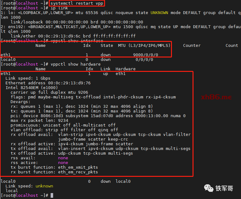 可以看到,在宿主机上已经看不到ens224接口了,对应的,可以在VPP中看到eth1接口。