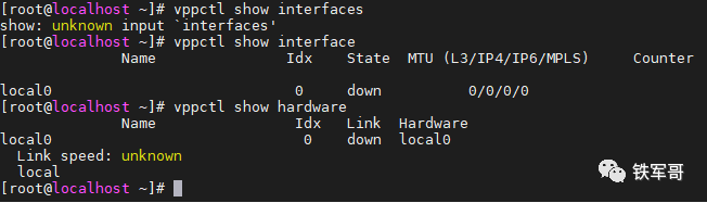 比如说我要将ens224这个网卡绑定到DPDK,首先查看VPP接口信息,可以看到只有一个local0接口。
