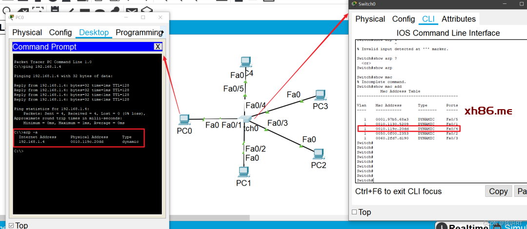 这样,当pc0(192.168.1)ping pc3(192.168.4)时,交换机查自己的mac表,发现自己的以太网fa0/4接口的出口对应的就是目的主机mac地址,则交换机将自己该数据报文转发从fa0/4接口转发出去。同时pc3收到了来自pc0的数据报文。