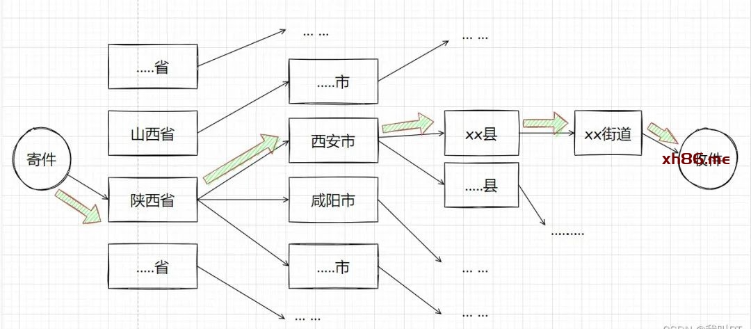 从上图的粗箭头所描述的路径便可达到目的地址,陕西省-西安市-xx县-xx街道-…。