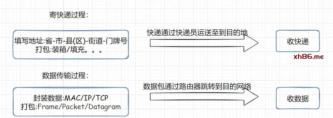 在整个网络中数据被封装成数据报文进行发送,就像我们生活中寄快递时将物品放进包裹中。而数据在路由器之间的跳转也可以看作是不同地区快递小哥对物流的交接。