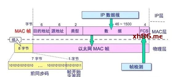 这个过程可对应网络中同一个交换机或集线器连接的局域网通信。在局域网中通信需要通过MAC地址进行通信。将数据封装成帧时会插入源mac地址和目的mac地址(如果不知到对方mac地址会发送arp广播报文获取对方mac地址)。以太网帧结构: