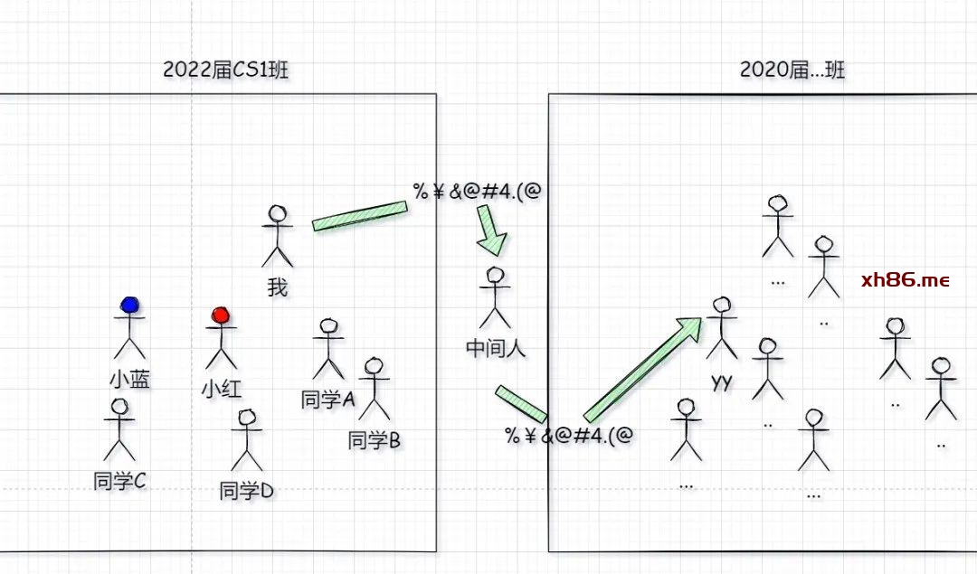 这就像是我是2020届计算机科学专业1班学生xx(学号202015162,15代指专业计算机科学专业,62代指“我”在本班的学号),我现在想找2022届学弟yy(学号2022…)。我们之间不认识,但是我可以找一个中间人,帮我送信。