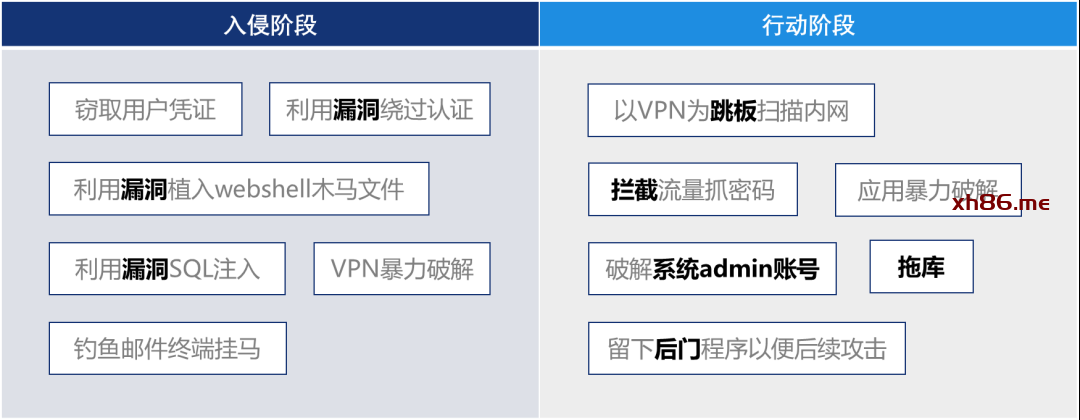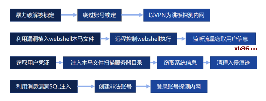 总结上述入侵套路,可以发现入侵的关键步骤就是利用VPN安全漏洞,控制服务端,再进行后续行动。