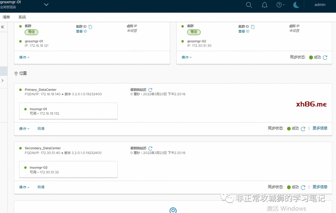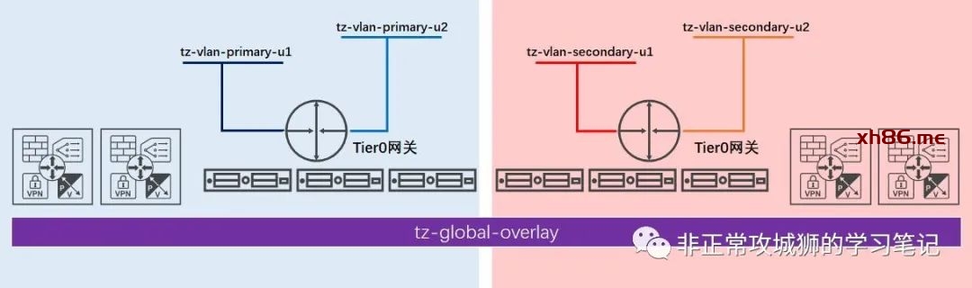 相同命名的默认Overlay传输区域用于多个数据中心之间分段L2延伸;而其余的四个VLAN传输区域,分别用于各自两个数据中心Edge传输节点承载的Tier0网关上联。