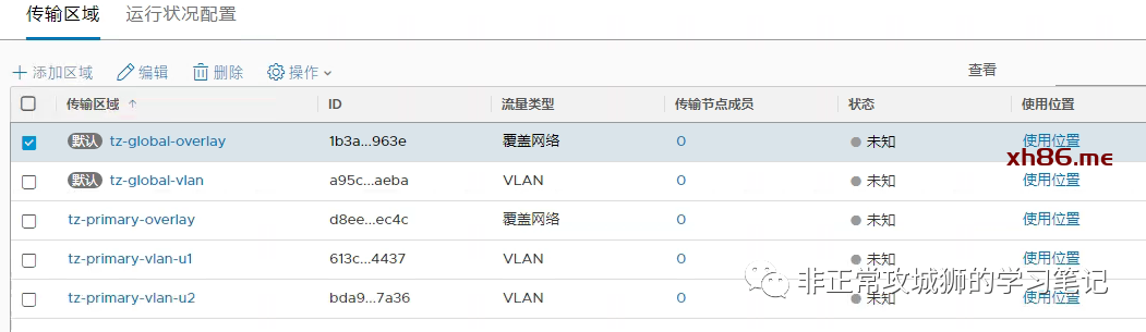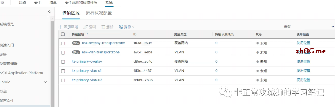 如下图所示,tz-primary-overlay、tz-primary-vlan-u1、tz-primary-vlan-u2分别是笔者创建的几个传输区域。但细心的朋友一定不难发现,在NSX-T Manager部署完成后,已经有两个默认创建的传输区域: