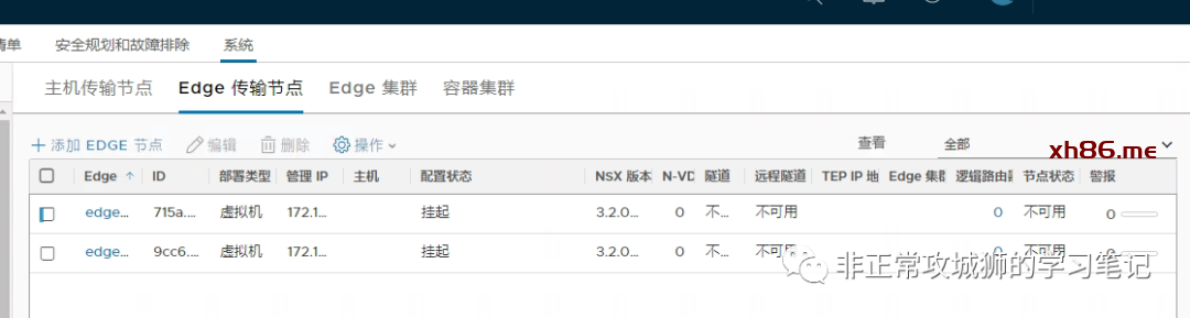如上图所示,笔者采用第二种方式来部署Edge传输节点,在完成NSX-T Manager的纳管之后,初始的状态显示为“挂起”“不可用”,这是正常的情况。