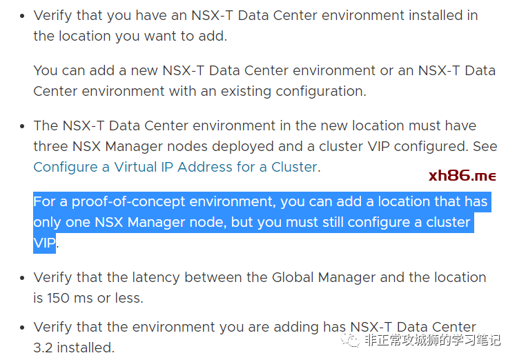 第二点,可以看到笔者的GM和LM分别都只有1台NSX-T服务器,并未部署集群模式。这当然是因为硬件资源的限制。但即便如此,LM也需要2个管理IP,其中1个作为单节点组成集群VIP地址来使用。下方是官网对于这个情况的说明: