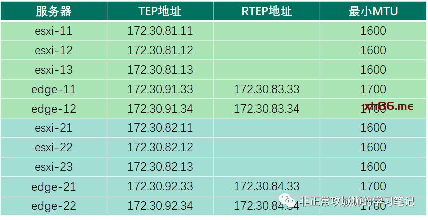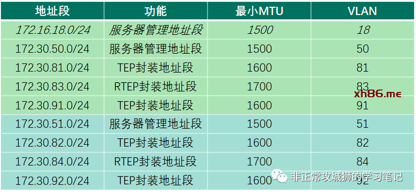 为了简化,大家可以将所有的基础架构服务器按照区域的划分,归纳为1个地址段。每个区域额外的3个地址段,用于该区域的Overlay封装使用。特别注意的是,管理服务器使用的网络,其MTU保持默认的1500即可。但作为Underlay网络来说,本地TEP地址段需要满足MTU1600,跨数据中心的Underlay网络来说,远端RTEP地址段需要满足MTU1700以上。为了确保“一劳永逸”,大家完全可以将MTU设置为9000以上。