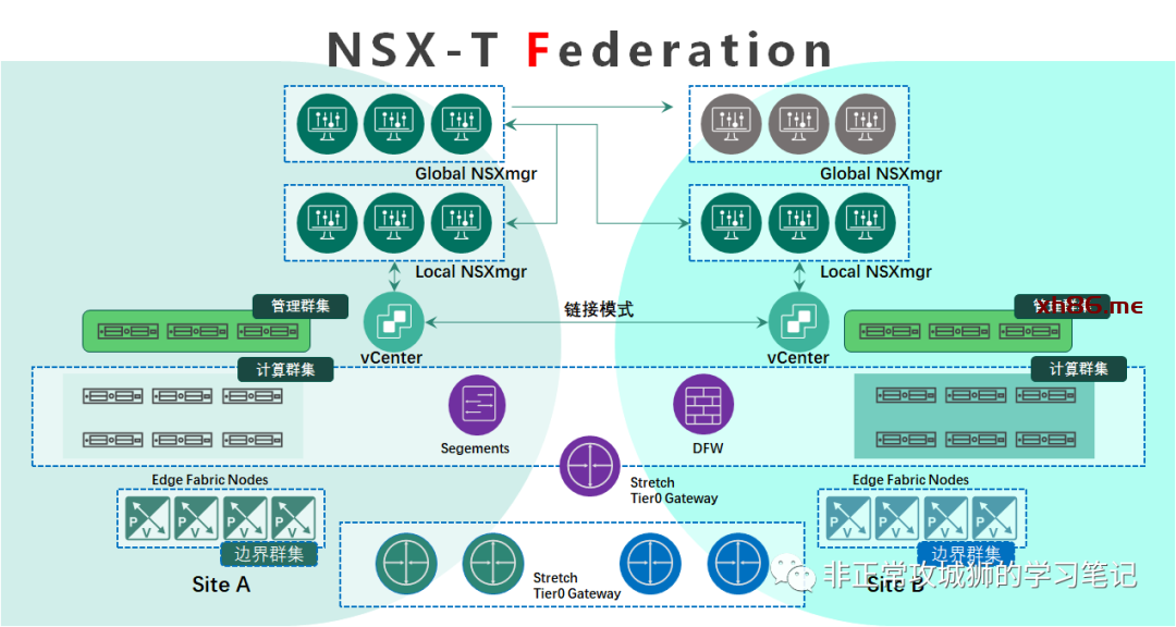 这说明不局限于上图中的两个数据中心,对于多数据中心、多分支站点,NSX-T Federation都是适用的。管理员会在每一个站点部署3台NSX-T LM组成一个集群,用于“承上启下”。所谓“承上”,是指LM作为Manager Server角色,接收来自GM的策略和配置,比如“定义一个全局的延伸分段”“定义一个延伸的Tier0网关”等等。所谓“启下”,就是它依旧作为站点内所有传输节点的集中管理平面,用于管理包括ESXi宿主机、KVM宿主机、Edge传输节点等数据平面相关的组件。当然,有一些配置,是必须由LM去定义和配置的,比如“本站点Edge传输节点的注册”、“虚拟机Edge传输节点的部署”这类操作。