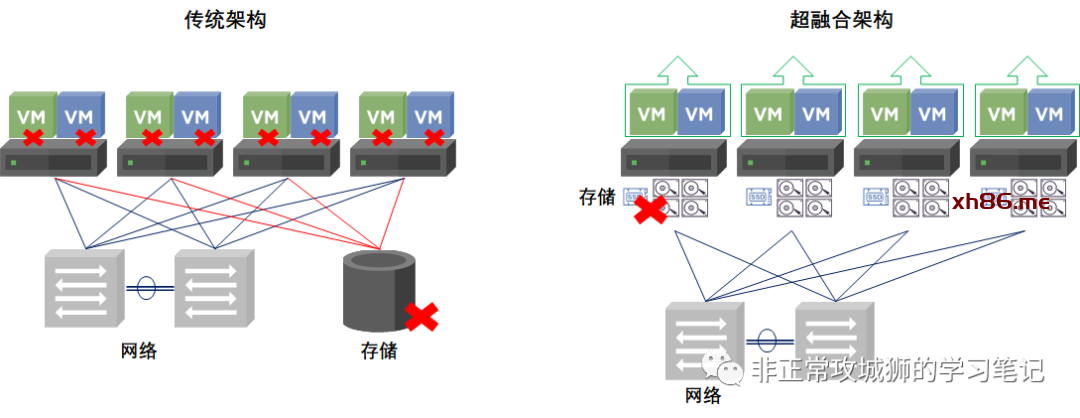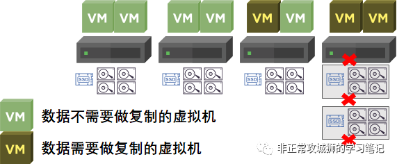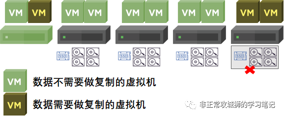 同样地,在采用超融合架构下,如果服务器上的一块硬盘或者整台服务器出现了故障离线,群集本身的“数据存储”并不会因此离线。其他虚拟机可以正常对外提供业务。由于服务器故障而导致异常关机的虚拟机,可以在触发vSphere HA之后,重新恢复业务生产。超融合架构就像“放鸡蛋”那样,将数据分布在每一台服务器、每一个磁盘组、每一块磁盘中,是“游牧民族式”的分布式数据存储,天生具备的高可用性是巨大的优势。