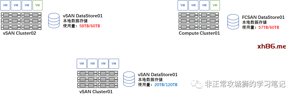 某客户数据中心,拥有三个群集,其中vSAN Cluster01和vSAN Cluster02采用超融合架构,Compute Cluster02采用传统存储架构。由于初期规划存在一些不足,在运行了一段时间后,管理员发现vSAN Cluster02和Compute Cluster01的数据存储空间出现严重的不足,而vSAN Cluster01还具有大量空闲的存储空间。