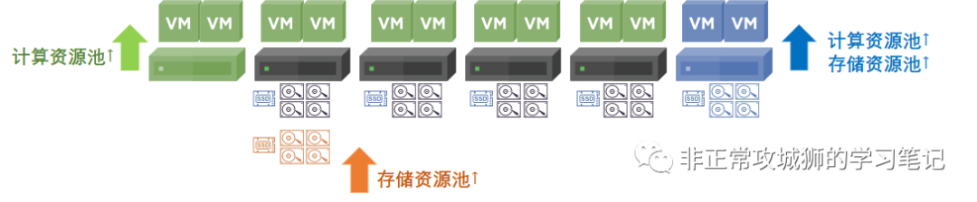当超融合提供的计算能力(如内存、CPU)随着业务的正常出现竞争的时候,管理员可以按需扩展主机。有些超融合产品支持这样的扩张,通常也会将超融合服务器节点分为“融合节点(计算+存储)”和“计算节点”两种。vSAN虽然也支持“无盘服务器”添加到启用vSAN的群集,但始终不作为最佳实践来推荐。