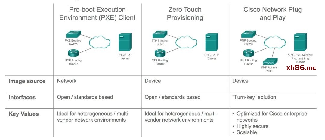 使用IOS XE操作系统的Cisco交换机和路由器支持3种Day0 Automation技术:iPXE、ZTP和PnP。其中PnP依赖于DNA Center,成本稍微高一些,但得到的是一个“交钥匙工程”,用户基本上不需要付出技术成本,还能够得到Software Image Management (SWIM)等增值服务。PXE和ZTP则是开源的解决方案。
