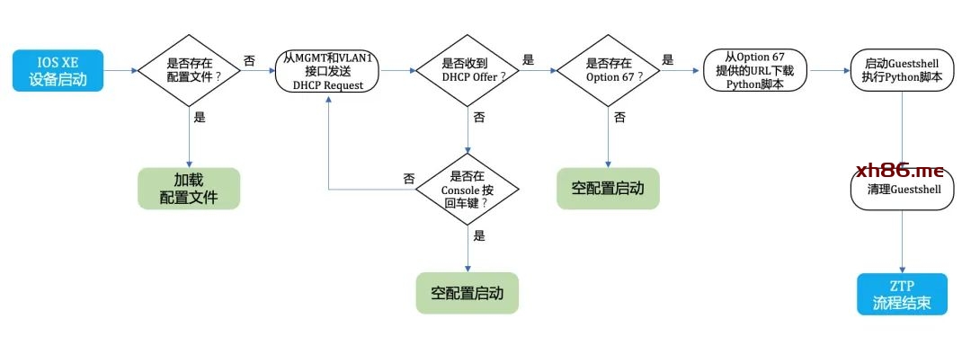 Clone之后,把里面的ztp-advanced.py简单改改就可以直接用了。请注意,这是一个Python2的脚本,如果设备出厂的IOS XE是17.3.1或者更高版本,需要将脚本修改成Python3。程序运行逻辑如下: