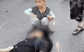 大人打120求救,小孩帮助受伤的男子挡住行人和阳光,孩子可以说是父母的影子,他们的行为其实就是父母的投射。