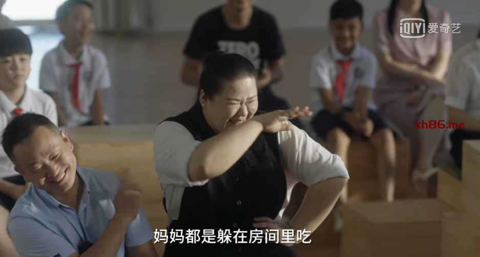 镜头切到台下的妈妈,有着跟男孩同样敦实的身材,笑得一脸尴尬。