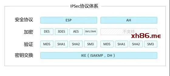 IPSec不是一个单独的协议,它给出了IP网络上数据安全的一整套体系结构,包括AH(Authentication Header)、ESP(Encapsulating Security Payload)、IKE(Internet Key Exchange)等协议。