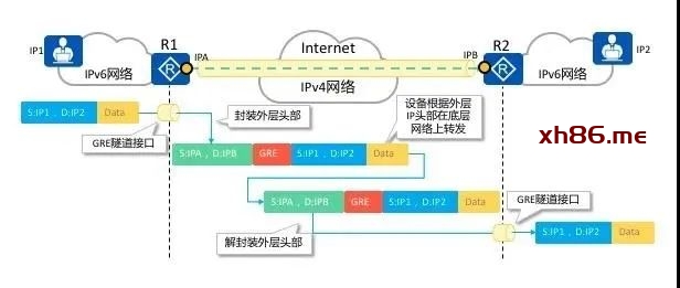 如图所示,通过在IPv4网络上建立GRE隧道,解决了两个IPv6网络的通信问题。