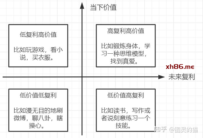 我们应该尽量去做右侧两个象限的事,就是选择高复利的事情做。