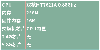 CPU是很主流的MTK7621,看来联发科挣了不少钱啊,很多路由器都可以见到这款CPU的身影,还有内置内存的7621D型号,内置128M内存的。官方的参数也很给力: