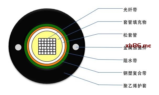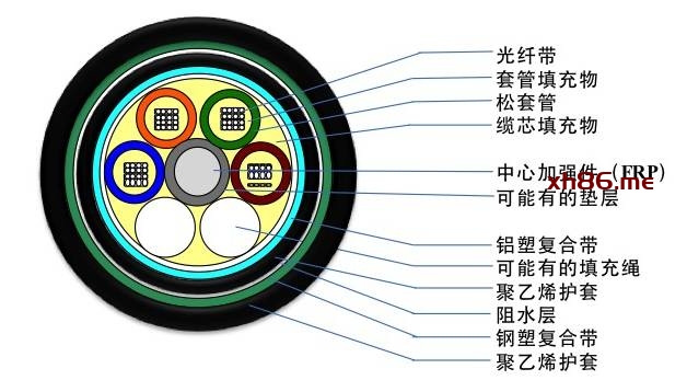 “室外用、非金属加强件、光纤带、油膏填充铝-聚乙烯内护套、钢-聚乙烯外护套”