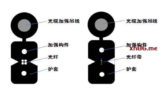 光缆结构是将光纤(或光纤带)放置在两根平行加强件中间,同时在一端平行位置放置一根金属吊线后挤包一层阻燃聚烯烃护套(LSZH);光纤芯数可以为1芯、2芯、4芯。