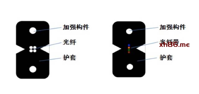 光缆结构是将光纤(或光纤带)放置在两根平行加强件中间后挤包一层阻燃聚烯烃护套(LSZH),也可以是聚氯乙烯(PVC)护套;光纤芯数可以为1芯、2芯、4芯。