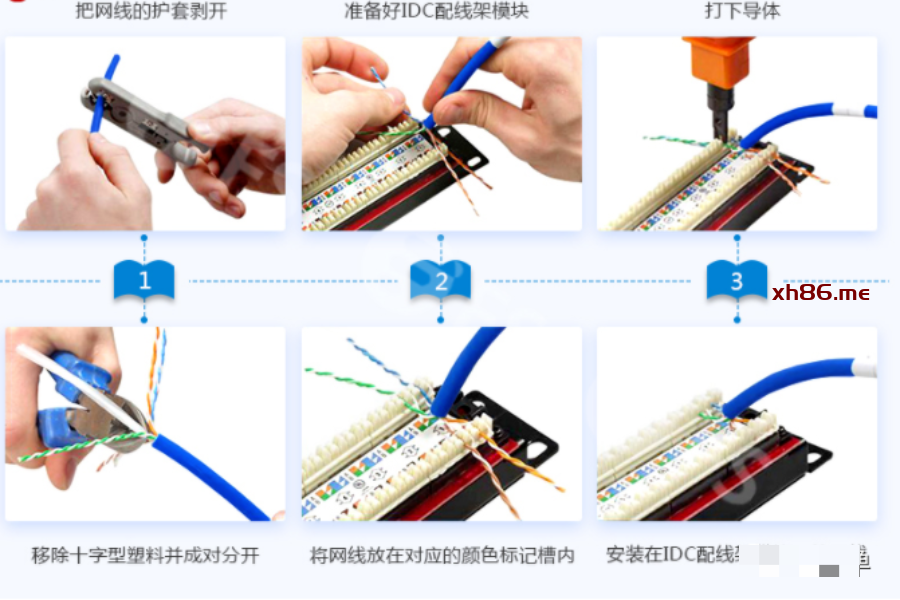 如上图所示,110配线架的打线步骤包括:剥开网线的护套、移除十字型塑料并成对分开、准备好IDC配线架模块、将网线放在对应的颜色标记槽内、打下导体、安装在IDC配线架模块上。以下是110配线架的打线注意事项: