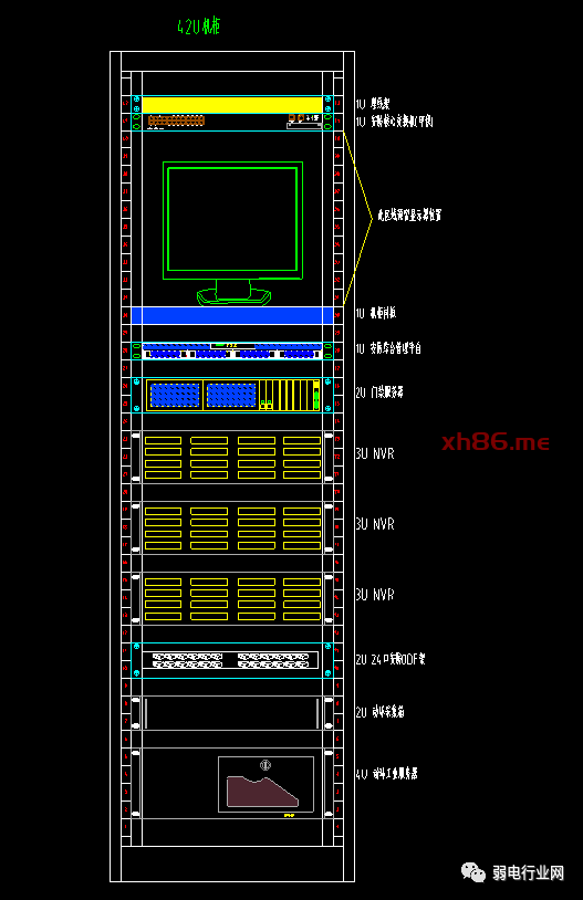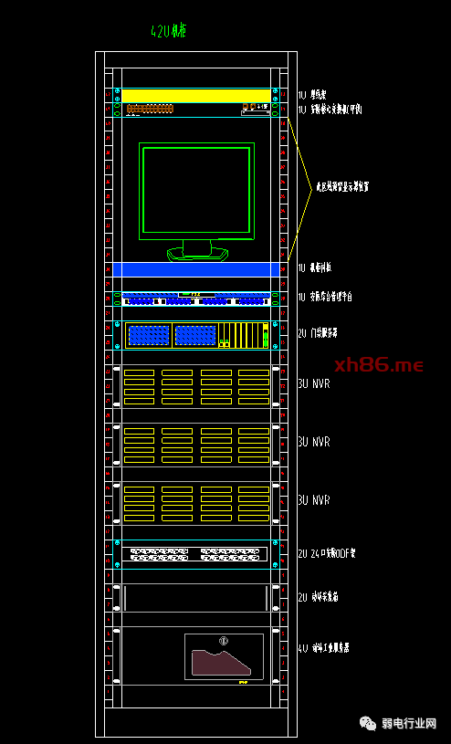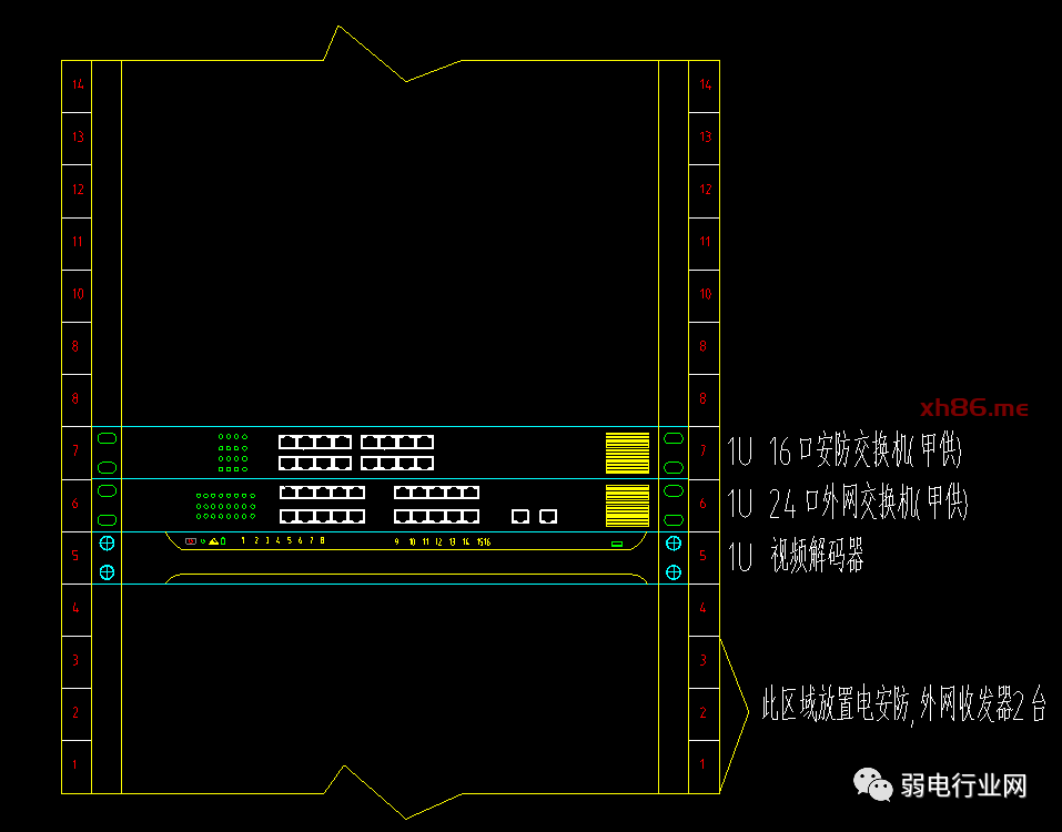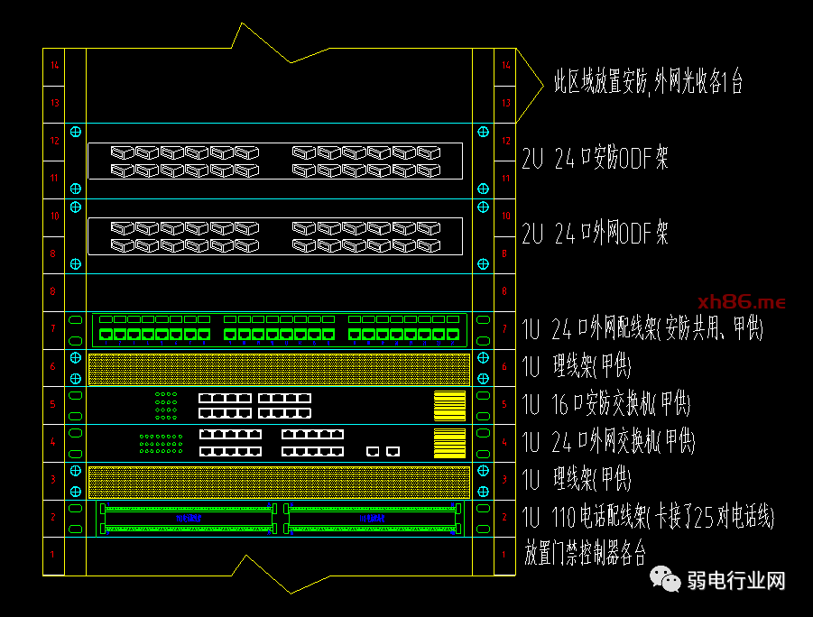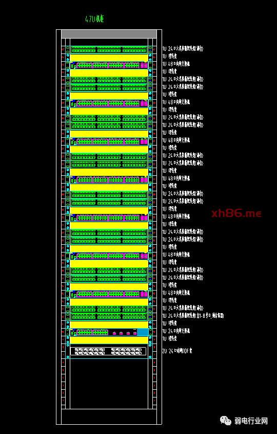4、配线架往下为有源设备区:差不多的设备根据功能及线缆链接需要安排位置,比如交换机,路由器、网桥三者是一一链接的,为了防止信号线的交叉及功能区域的易于维护,最好的排列顺序从下往上是网桥-路由器-交换机。