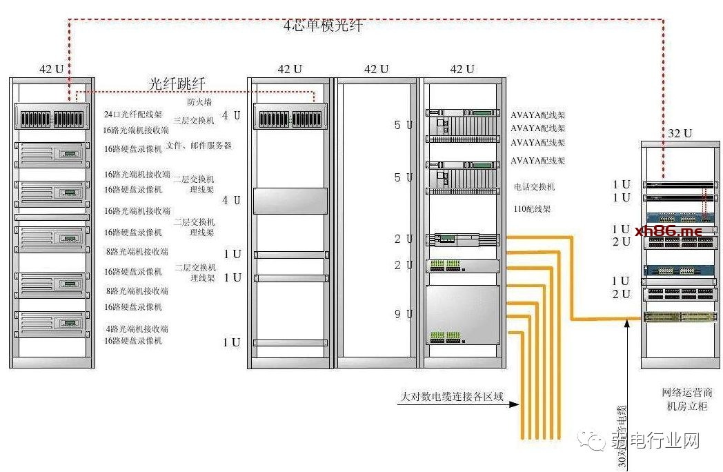 1、机柜由上到下主要分为四个区域:交流分配单元、配线架、有源设备、光缆终端盒。