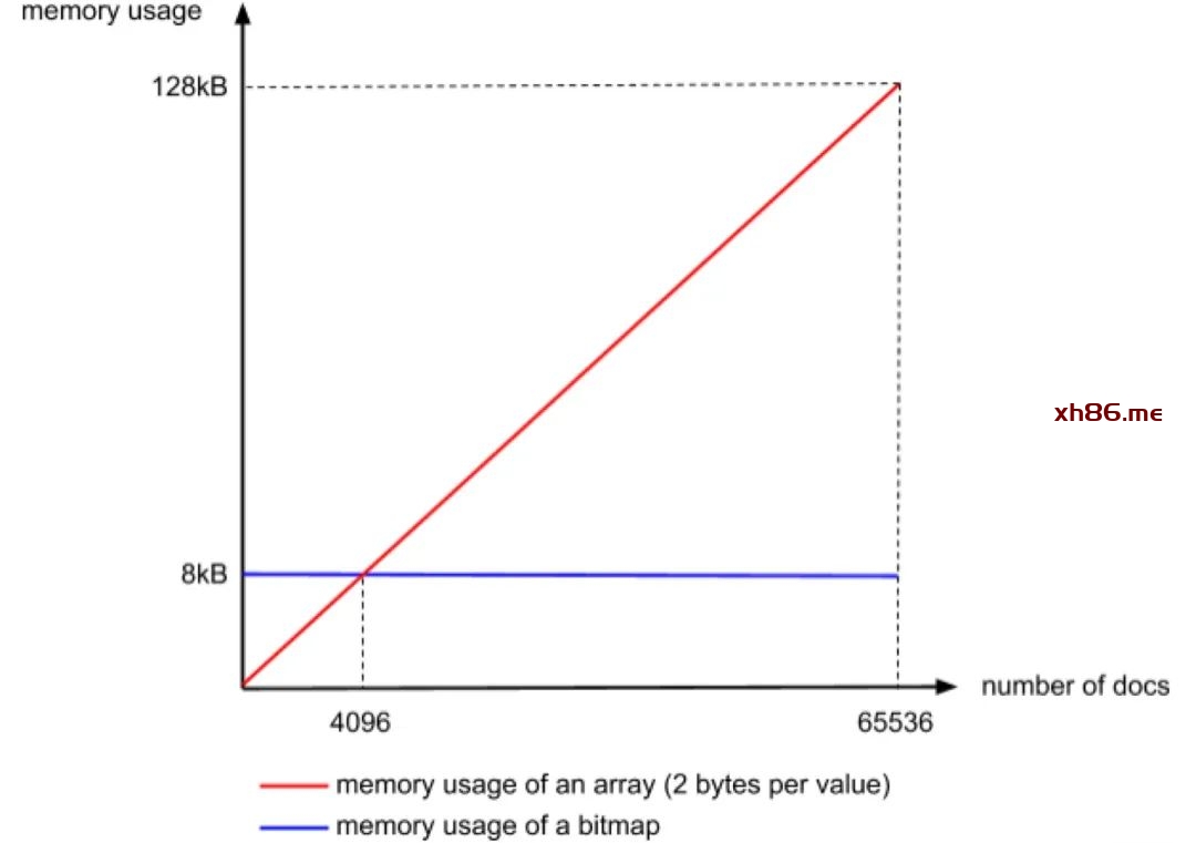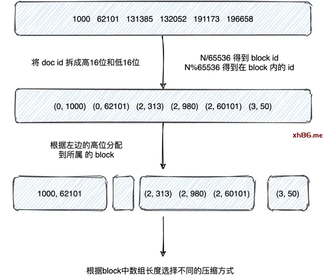 将 doc id 拆成高 16 位,低 16 位。对高位进行聚合(以高位做 key,value 为有相同高位的所有低位数组),根据低位的数据量(不同高位聚合出的低位数组长度不相同),使用不同的 container(数据结构)存储。