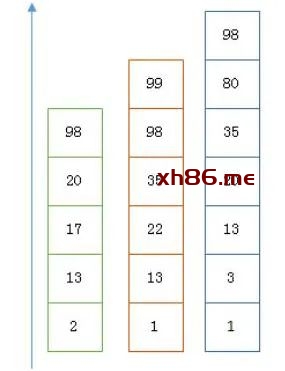 以上是三个 posting list。我们现在需要把它们用 AND 的关系合并,得出 posting list 的交集。首先选择最短的 posting list,逐个在另外两个 posting list 中查找看是否存在,最后得到交集的结果。遍历的过程可以跳过一些元素,比如我们遍历到绿色的 13 的时候,就可以跳过蓝色的 3 了,因为 3 比 13 要小。