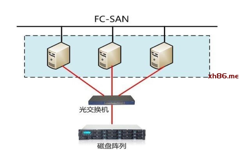 SAN是一个存储的区域网络。是由光纤 以及SAN交换机 SAN卡 存储组成。形成一个存储网络。作用于服务器集的作用。他有自己的传输协议。无法工作在以太网中。成本很高。